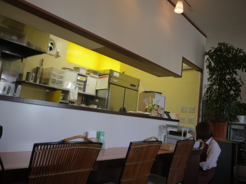 テーブルが4人掛けが3つ、二人がけがひとつ、あとカウンターです