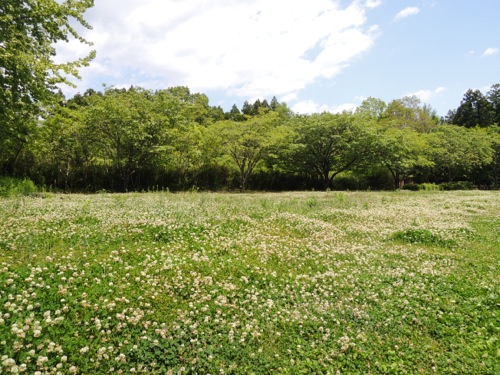 車を止めるとその前は朝っぱらになっていてシロツメクサが一面に咲いていてとってもいい感じでした。