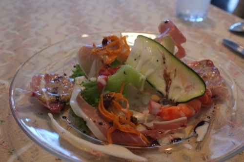 前菜は生ハムと海老と鰤のカルパッチョだったよ。見た目も綺麗でおいしかったよ。