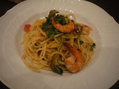 マルティロランチのパスタはエビとモロヘイヤのスバゲティー•サルティーニャ産カラスミがけ