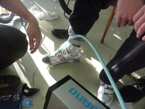 Tさんの自転車を取りに、ネモトさんに行ったら、知り合いの旦那さんがシマノ カスタムフィット シューズ システムをやっていた。