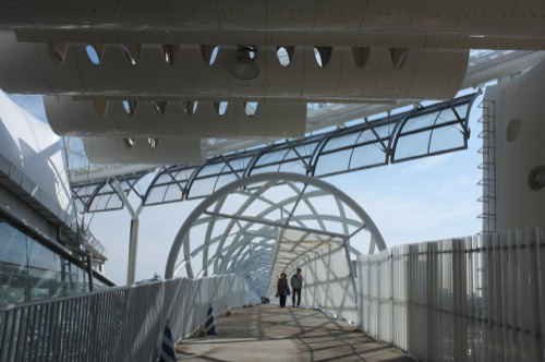 風が強いので通路を使って会場へ向かいます。