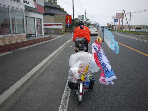俺ちゃんからの帰り道、前を行く自転車がふらふらしていると思ったらサイクルトレーラーを引っ張っていました。 (^_^)