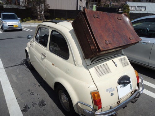 三春のベニマルでちょっと補給食を買ってトイレ休憩していたら、そしたら駐車場にフィアットに革のカバンをトランクにしたまるでカリオストロの城のルパンが乗っている車のような感じでした。