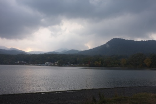 十和田湖は曇りの空からわずかに朝日がこぼれています。
