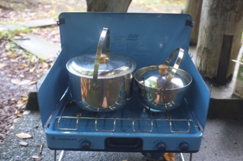 三人で七輪で肉を焼いて、あとはタラナベ