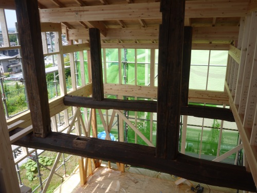 現場に行ったら吹き抜けに古い梁を使っていました。構造的には必要ないのですが、建て主さんの古い家で使っていた梁を残しておきたいという事で使ったそうです。