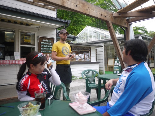 TOYBOXSさんがスポークの修理に駆け回っている間私たちは駅前でお茶タイム (^_^;A