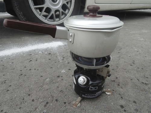 今回はコールマンのピークワンのガソリンストーブも持ってきたのでそれでお湯をを沸かすことにしたよ。