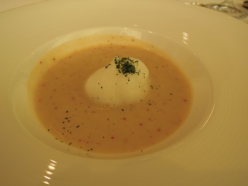 スープは五郎島金時のスープで上に豆乳の泡が乗っていました。