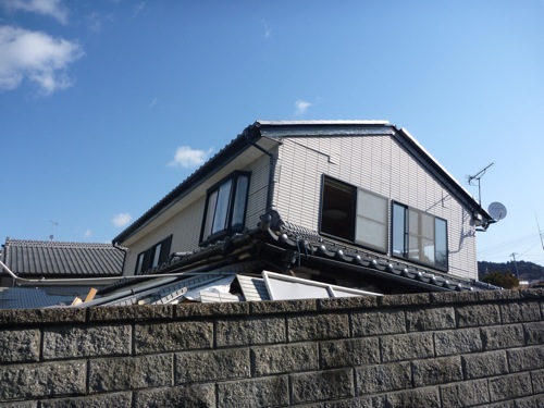 走り出すとブロック塀が倒れ屋根の瓦が落ちています。