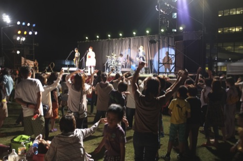 ゆざ町夕日まつりもはじまり、浴衣姿の人がステージで歌っています。