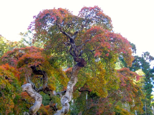昭和12年に国の天然記念物に指定され、上部から徐々にオレンジから赤のグラデーションを描きながら染まり、色の変化も楽しめます。根周り3mの木は地上1.5mのあたりから枝分かれし、ねじれて傘を広げたような特徴ある様相を見せています。紅葉の11月頃が見頃だが、新緑の頃や葉を落とした後の枝ぶりを鑑賞するなど、四季を通じて楽しめる。紅葉は11月中旬から色付き始める