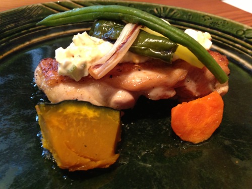 私は前菜はナスのムースとカンパチの薫製添えを選びメインディッシュはわさらのソテーにしました。