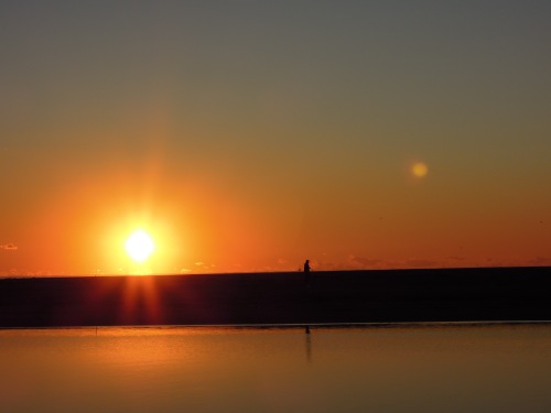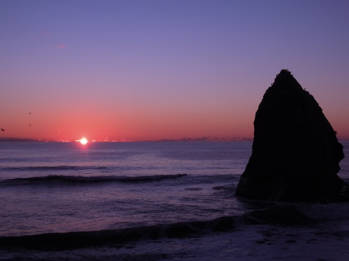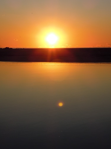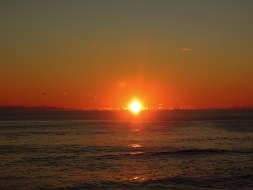 快晴でも水平線には雲がいつもあるのですが、今日は丁度雲が切れたところから太陽が上がってきました。 (^o^)v