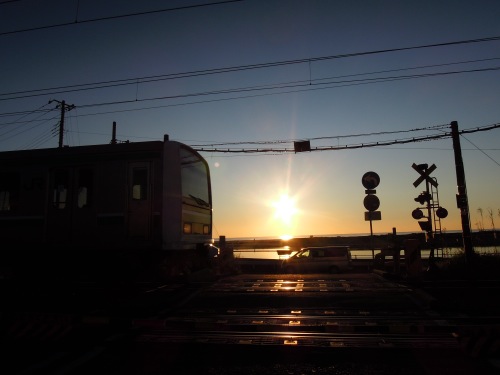 日の出と電車がうまい具合に重なりました。 (^_^)