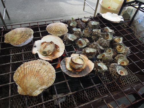 ホタテやサザエを焼いてうっていました。