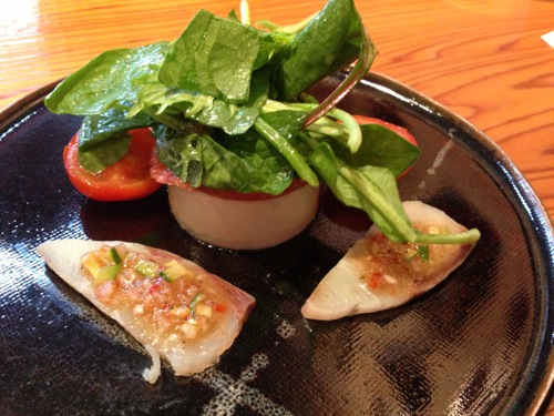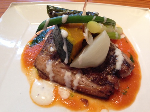 私は前菜はナスのムースとカンパチの薫製添えを選びメインディッシュはわさらのソテーにしました。