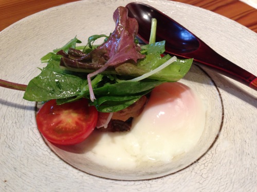 Oさんは前菜はラタトゥユ生ハム温泉卵添えを選んでメインディッシュも鶏肉の照り焼きにしました。