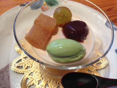 デザートもちょっと和風にきなこ餅とアンコとアイスクリームとブドウで、おしゃれな感じで美味しかったです。