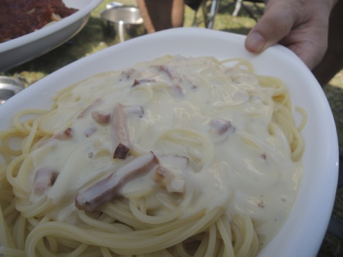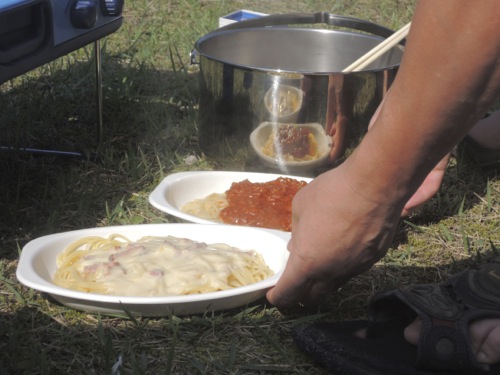 朝飯は前日にトライアルで買っておいたパスタを茹でて、レトルトのソースをかけて食べました。