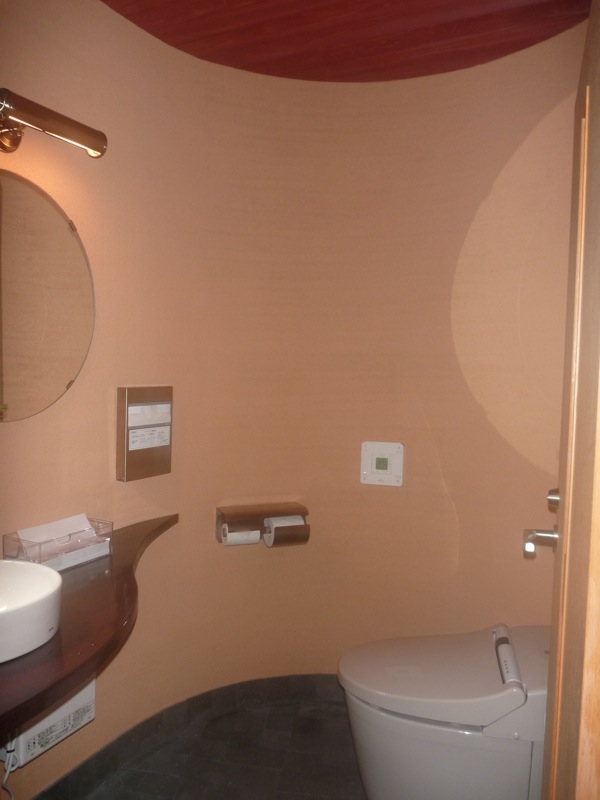 ホールは板張りで、トイレは溶岩石