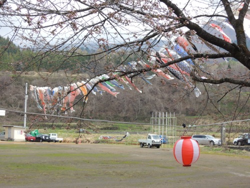 途中小学校で鯉のぼりがたくさんなびいていました。