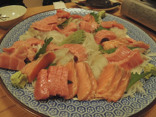 料理は、アンコウ鍋と中トロが入った刺身盛と煮魚