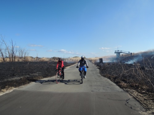 サイクリングロードを走っていると、草を焼いていました。