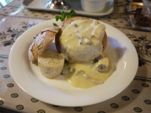 (カンパーニュをくりぬいて作った器でクリームシチュー