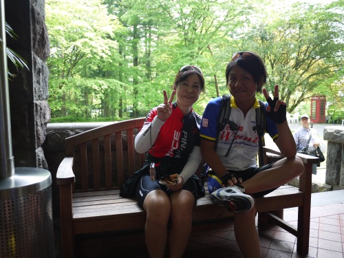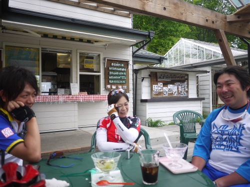 TOYBOXSさんがスポークの修理に駆け回っている間私たちは駅前でお茶タイム (^_^;A